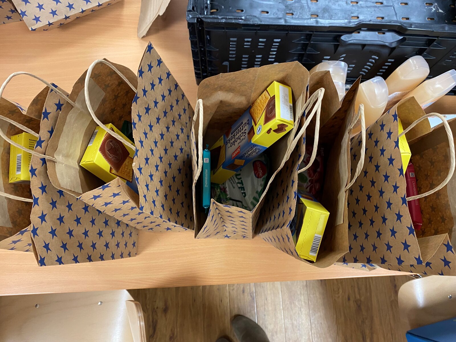 Allein 118 Weihnachtstüten für wohnungslose Frauen und Männer werden in diesen Tagen - unter Einhaltung der aktuell geltenden Corona-Regeln - von Mitarbeitenden aus dem Personalmanagement der BASF Personal Care and Nutrition GmbH liebevoll vor Ort am Platz der Diakonie gepackt. Fünf Mitarbeiter*innen kommen dazu nach Feierabend vorbei, um Kämme, Schokolade, Duschgel und eine Weihnachtsüberraschung in die Tüten zu packen.